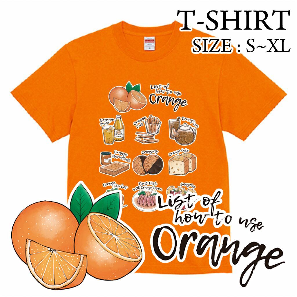 オレンジとその使い方をリストのように並べた絵柄のTシャツです。