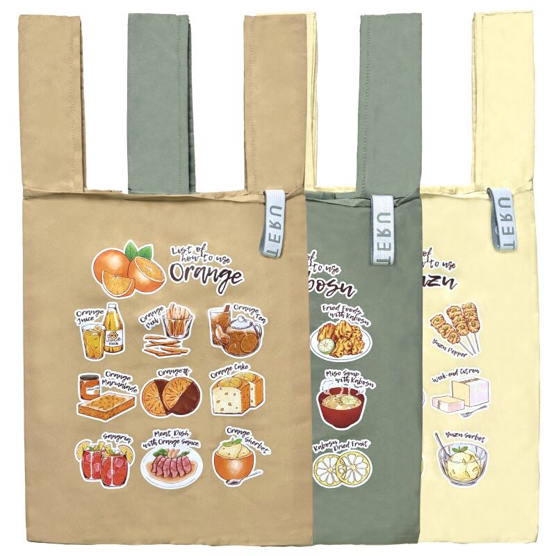 かぼすとその使い方をリストのように並べた絵柄のエコバッグです。